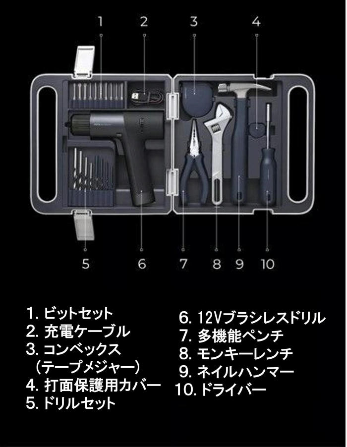 - “12Vブラシレスドリル”は大容量の2000mAhのバッテリー容量を誇り、充電にはUSB Type-Cケーブルを使用するためスマホのように簡単に充電できます。