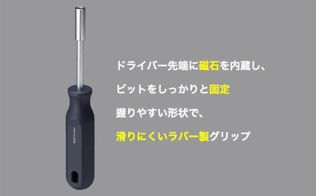 ・ドライバー先端に磁石を内蔵し、ビットをしっかりと固定