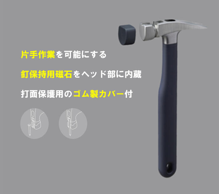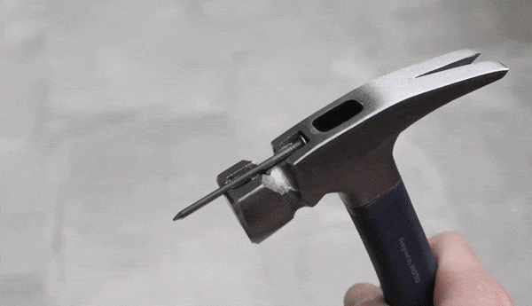- HOTO ネイルハンマーにはヘッド先端に釘を収められるスペースがあり、内蔵の磁石で釘を固定できるため、片手で簡単に釘打ちが可能です。