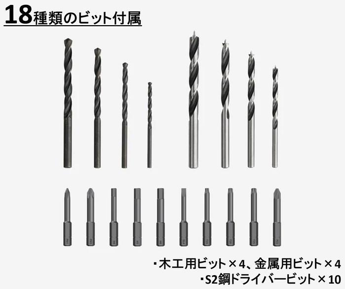 - “HOTO SET PRO”には18種類のビットが付属しているため、穴あけとネジ締めといった様々なシーンに対応可能です。
