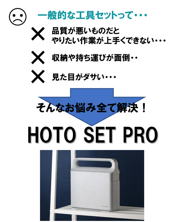 - HOTO SET PROは、日常のDIYシーンで最も使用する基本的なツールを揃えた工具セットです。一家に一台あるだけで、家具の組立や家電の修理等、幅広いDIYに対応可能です。