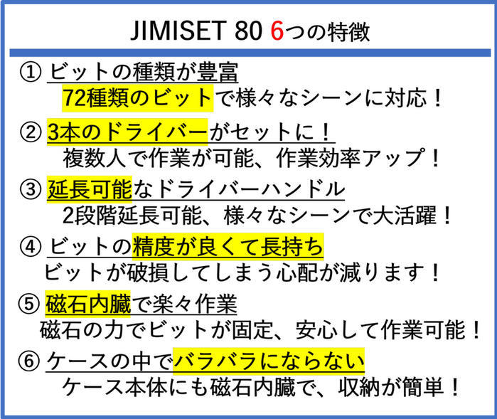 • 美しくコンパクトなプロダクトデザインはそのまま、より大小様々のネジに対応可能なビット数を拡大したモデル、”JIMISET 80”をご紹介させて頂きます!!