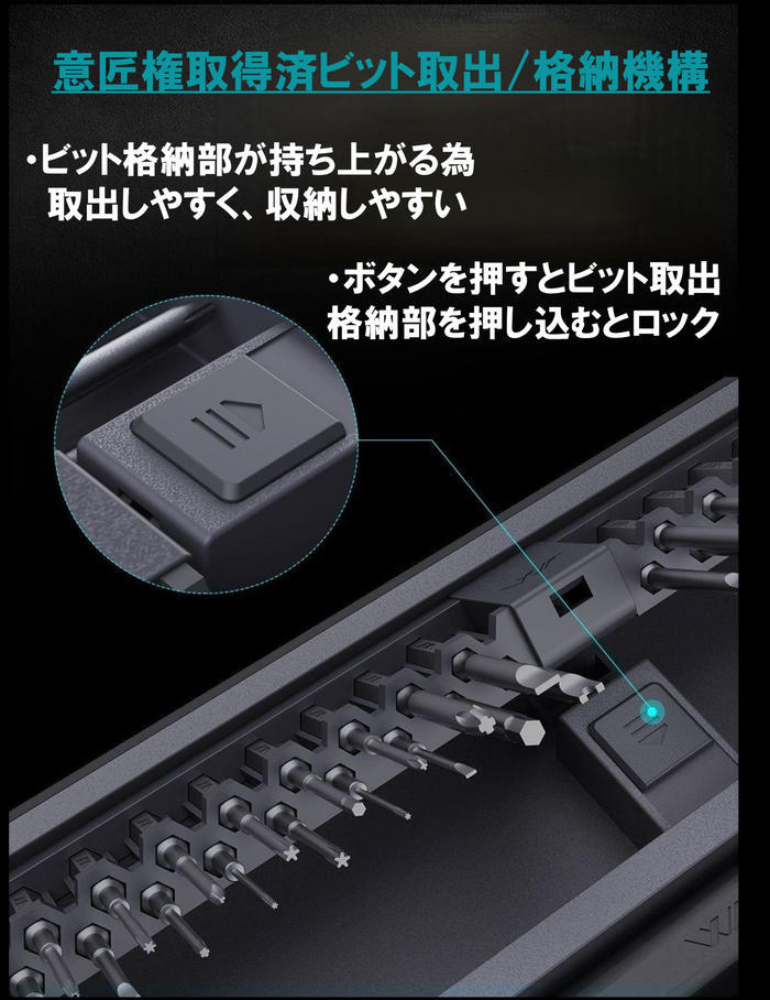 ”JIMISET 80”なら、中国国内で意匠権登録済のビット収納ギミックを採用しており、ボタンをスライドするだけでビット収納部が飛び出してくるため、