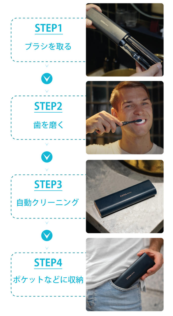 - ZERA SONICには、毎分50,000回振動させる音波発生装置が搭載されており、歯についた食べ物や飲み物の残留物を優しくこすり落とします。