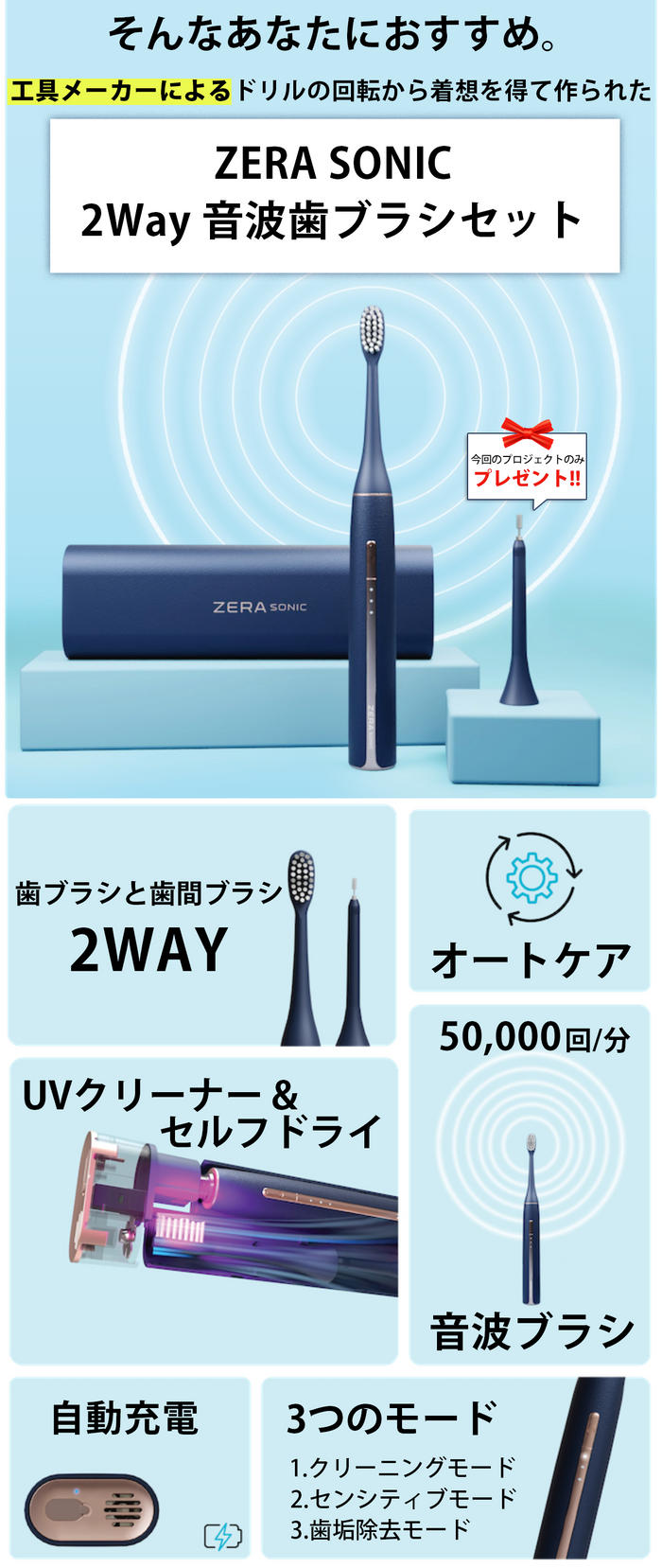今回紹介のZERA SONICは、歯間ブラシと歯ブラシの音波ブラシセット。自動充電やオートケアケースなど目新い機能が満載でとても便利だと感じ今回プロジェクト起案に至りました。 -