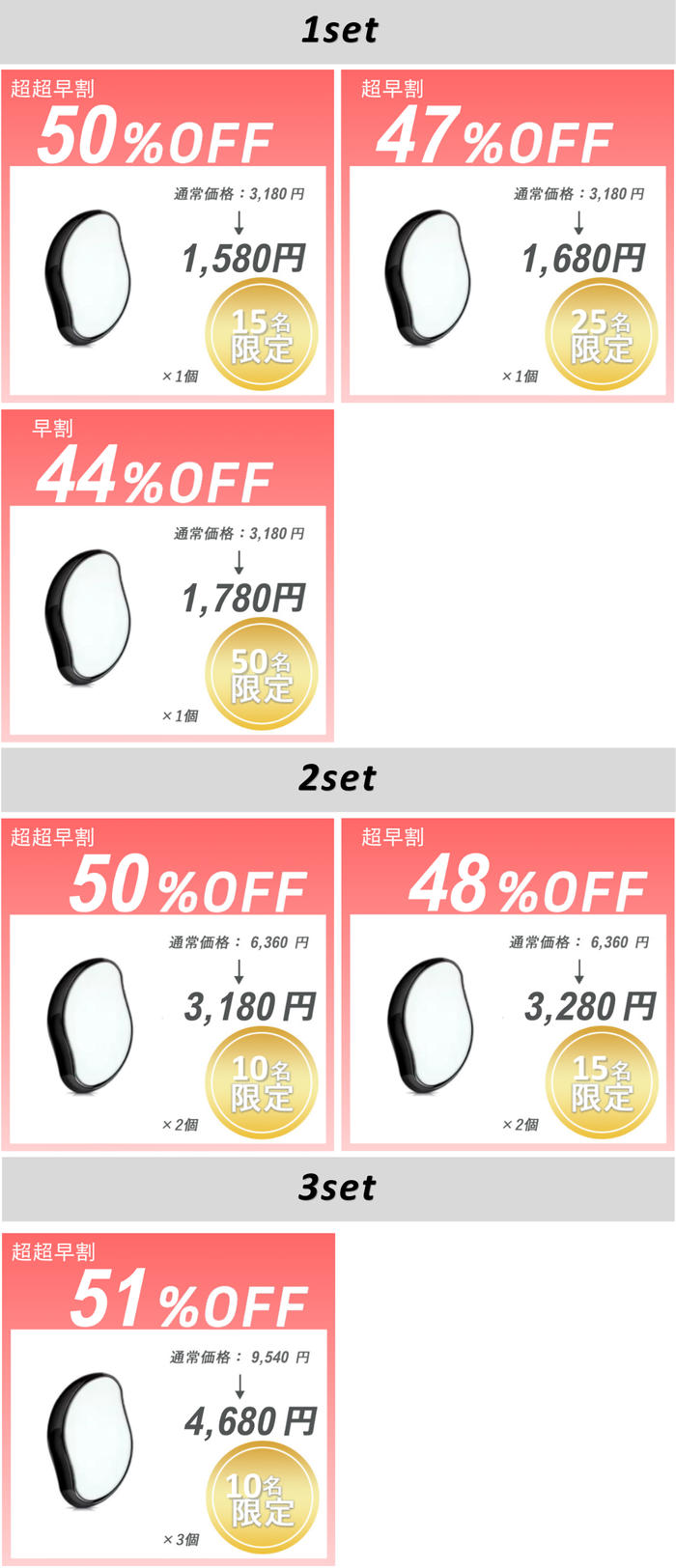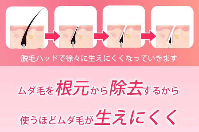 Crystal 脱毛パッドを繰り返し使用するごとにムダ毛の再生を遅らせ、徐々に生えにくくしていきます。