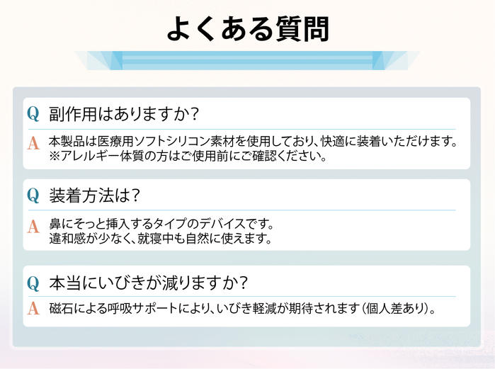 本体内部に磁石が内蔵されており、装着することで鼻腔を広げて通気性を改善し、呼吸をサポートします。