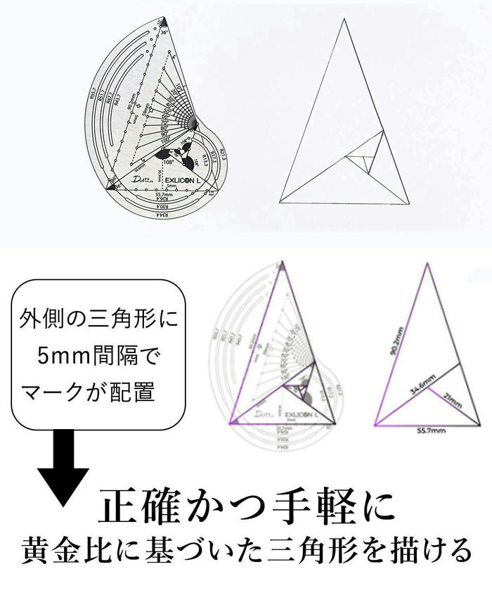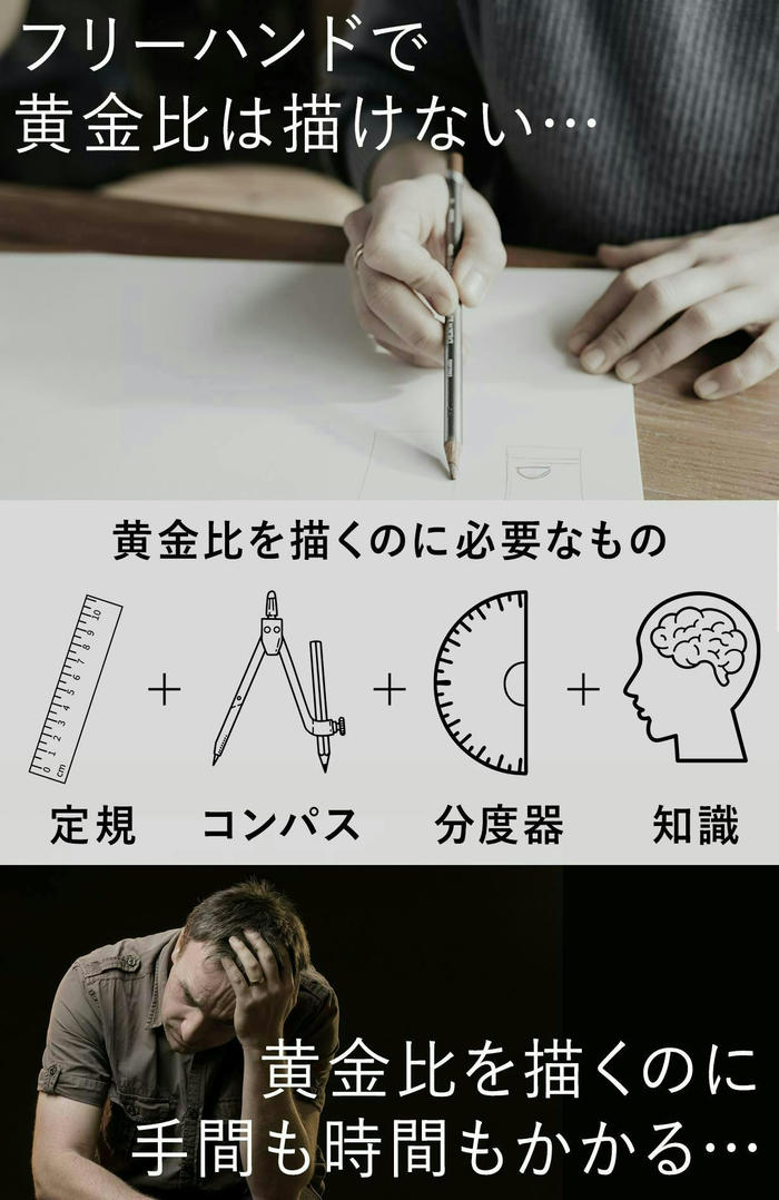 - 黄金比という名前は知っていましたが、自分で描くのは本当に難しい上に、計算や測定が面倒で、もっと簡単に正確に描けたらいいのに…とずっと感じていました。