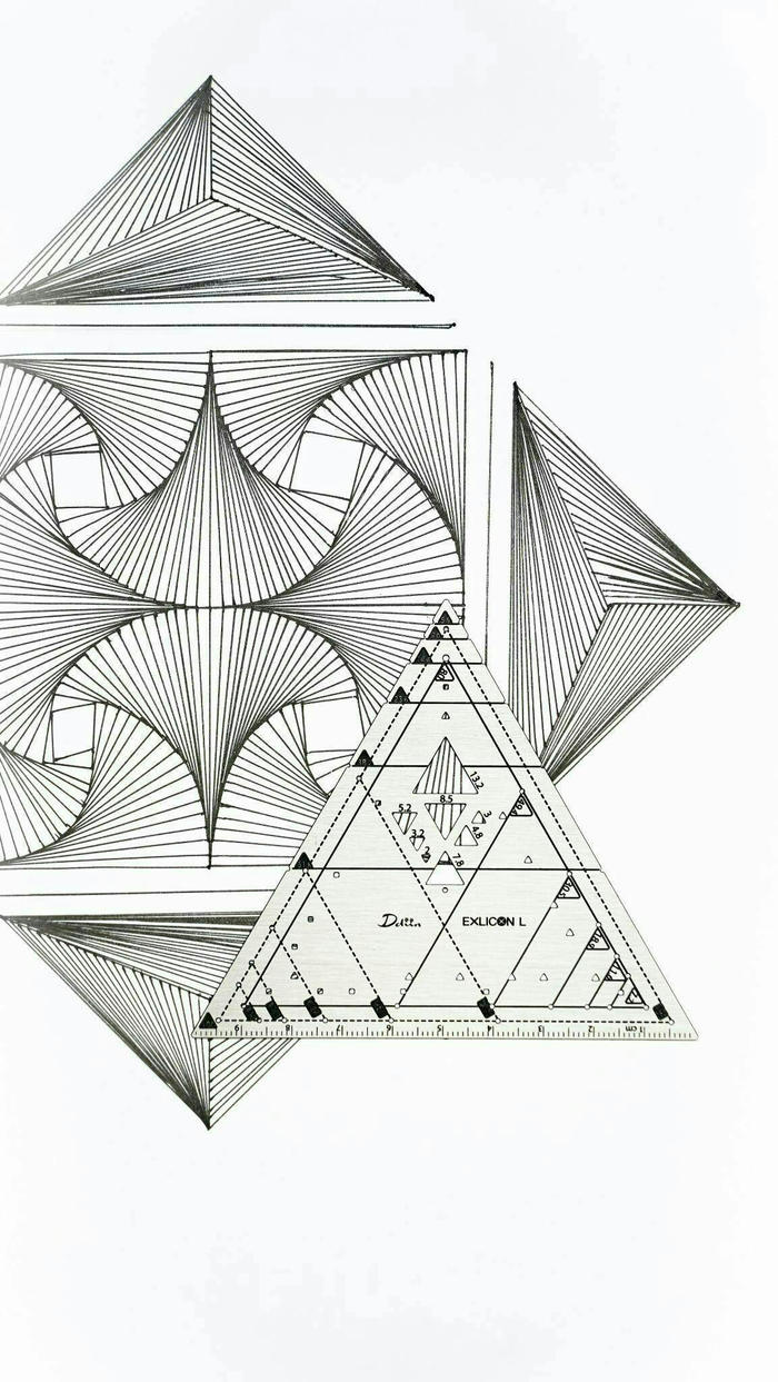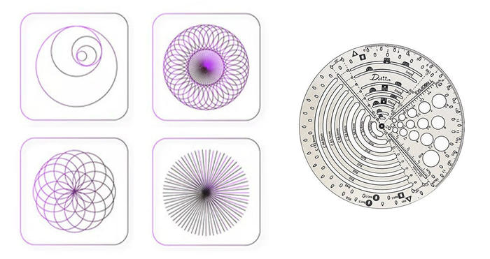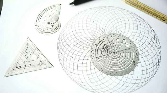 A:円、三角形、黄金比に設定された三角形、黄金比に設定された円、放物曲線、放射線、グリッド、マンダラ。