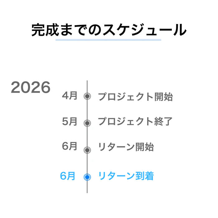 ※本文中に記載させていただいたスケジュールは、あくまでプロジェクト公開時点の予定です。クラウドファンディングを経て輸入を行う性質上、配送遅延のおそれがございます。